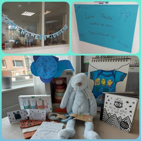 Twee weken voordat ik met vervroegd verlof zou gaan, stond er een verrassing op mij te wachten op het werk. Ik kwam die woensdagochtend aan en zette zoals altijd mijn tas even op het bankje in de hal. Hing mijn jas op en liep de groepen langs om alle collega’s een goedemorgen te wensen. Niks geks aan, zo doen wij dat elke ochtend, dus ook nu. Ondertussen besefte ik wel dat het de laatste werkdag met mijn lieve naaste collega zou zijn, want zij was de week erop vrij.Er gingen totaal geen alarmbellen rinkelen. Die rinkelden wel toen ik mijn tas weer van dat bankje afhaalde. In eens zag ik door het raam van de groep allemaal blauwe slingers en ballonnen hangen. En op de deur hing een poster om mij welkom te heten op mijn ‘babyshower’. Zó ontzettend leuk!!